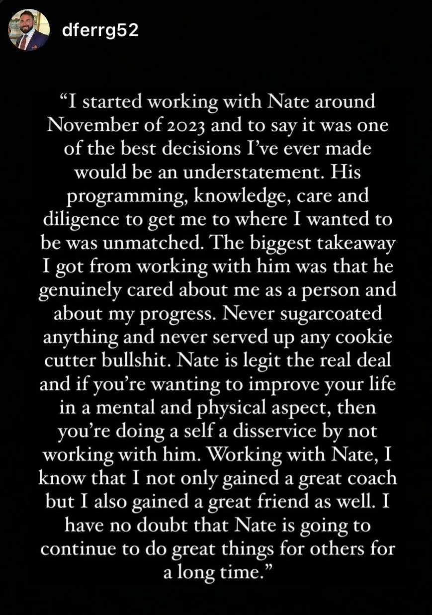 Dalton put it plainly: working with Nate Devers was “one of the best decisions I’ve ever made.” Not because it was easy — but because it was real. The programming, knowledge, care, and diligence were unmatched… and the biggest difference was this: Nate genuinely cared about him as a person, not just a progress photo. No sugarcoating. No cookie-cutter templates. Just honest coaching, real accountability, and a standard that elevates you mentally and physically. The result isn’t only a better body — it’s a better life… and the kind of mentorship that can turn a coach into a friend.